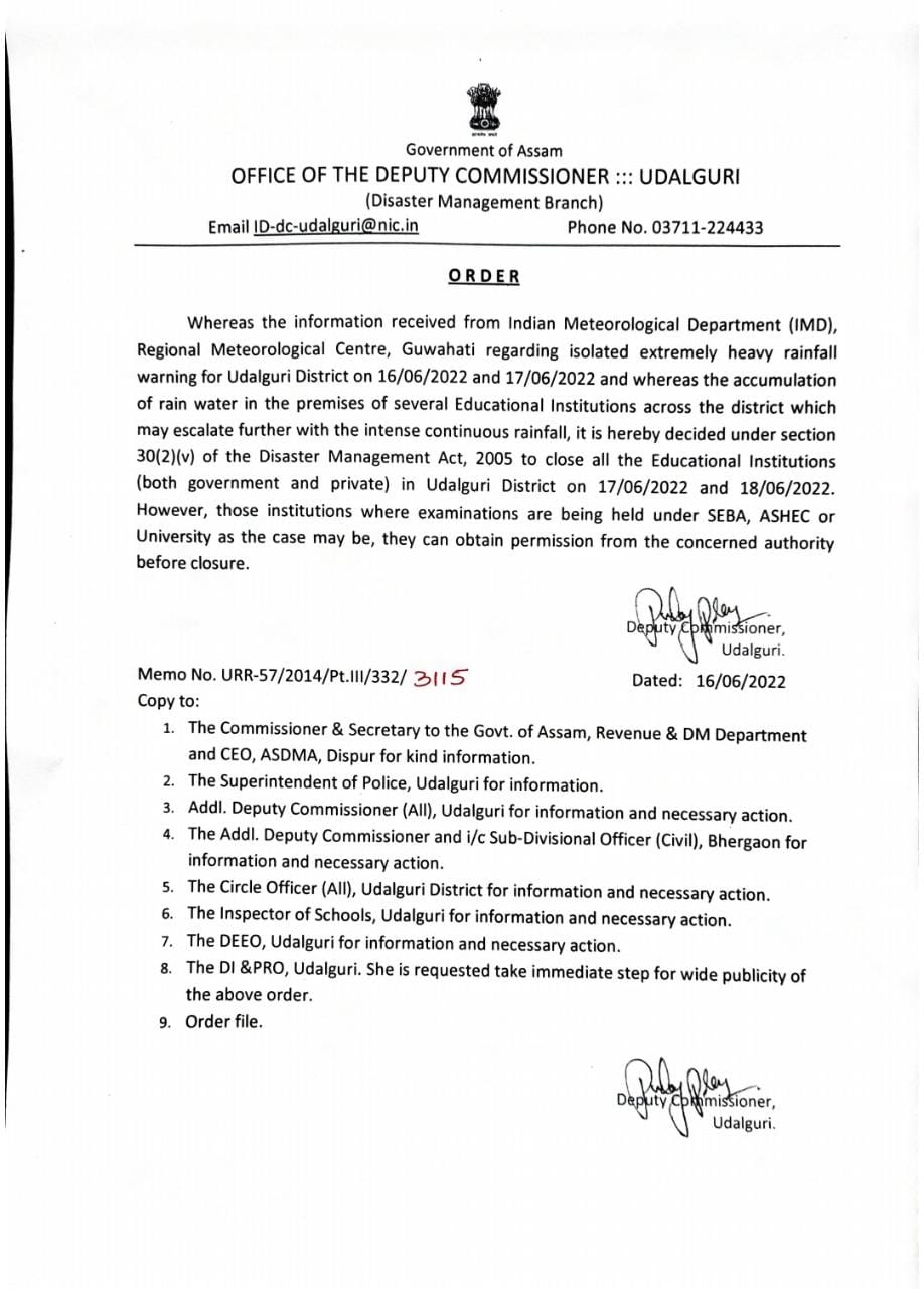 As per the order from the district administration, Udalguri, our school will be closed on 17th and 18th June, 2022.